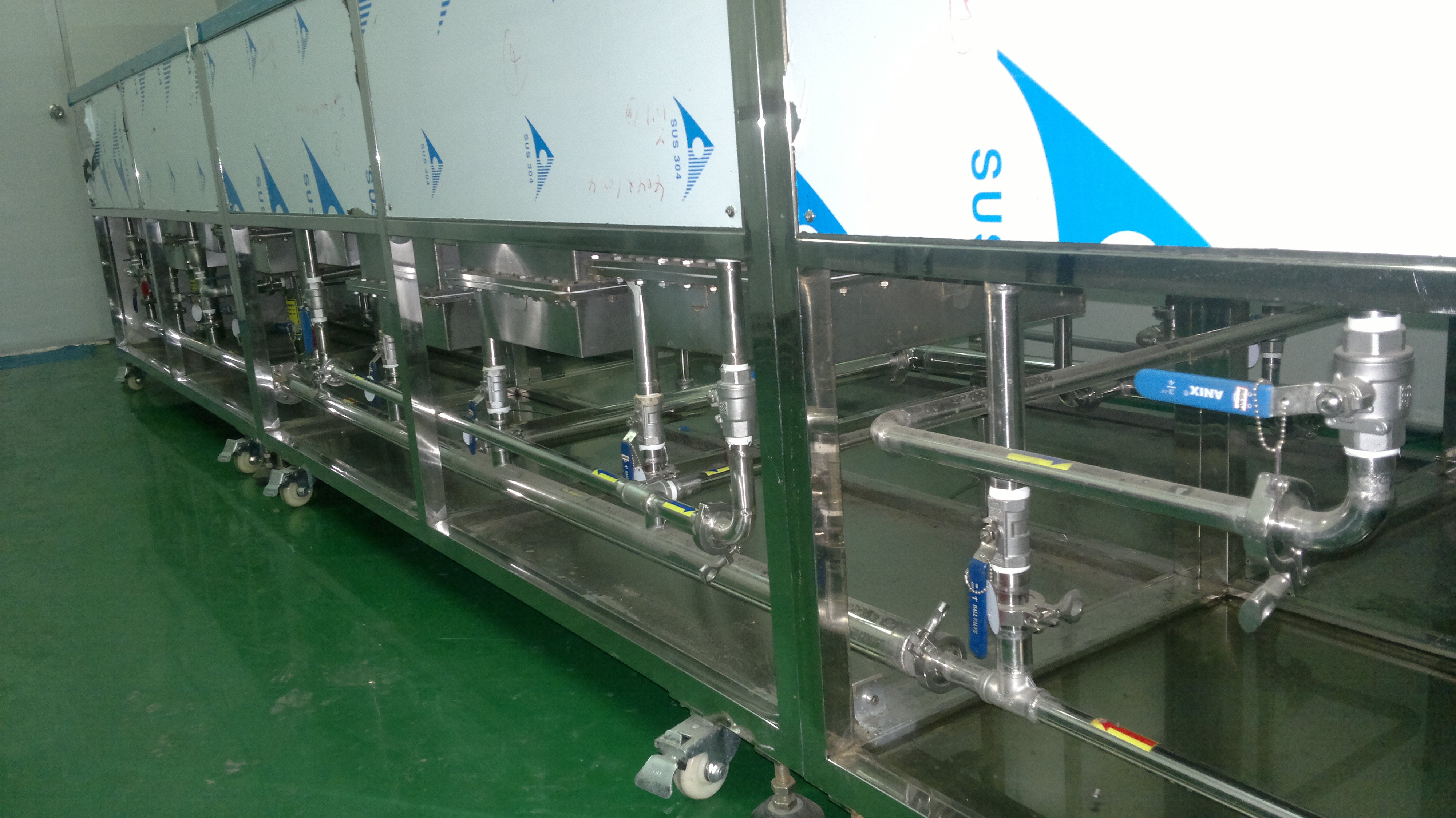 半封閉,方便操作閥門。仔細看看,管路都是法蘭連接。我們?yōu)槭裁匆M那么多勁來鎖這么多螺絲?鎖震板?做這么多法蘭?直接焊根管路不多好?因為我們考慮了如果管路里進了東西,或者要檢修。要跟換都會很方便。。方便售后。清洗機,請不要選用PVC管路。漏水的時候會很麻煩。拋光管也要用好的。不然純水機出來的水再好。經(jīng)過內部生銹的管路,也是不合格的純水。。槽底做了接水盤。就算有漏水的情況,也不會流的無塵間到處是水。。